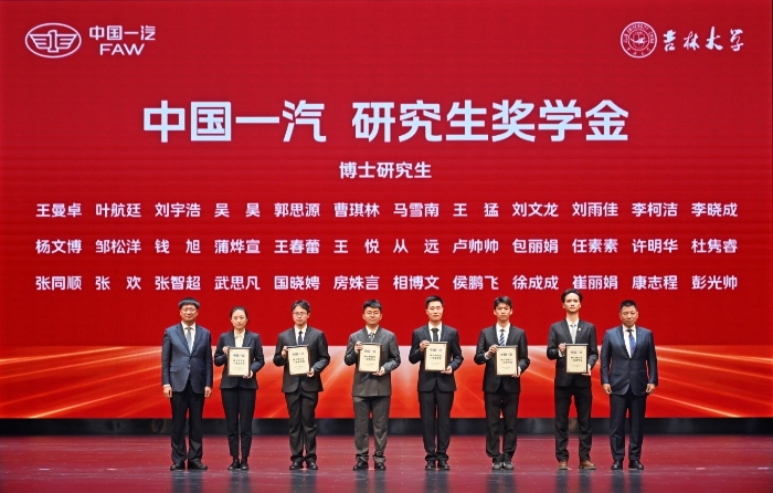 中國一汽總經理、黨委副書記劉亦功,吉林大學校長、中國科學院院士張希為中國一汽研究生獎學金(博士研究生)獲獎代表頒獎