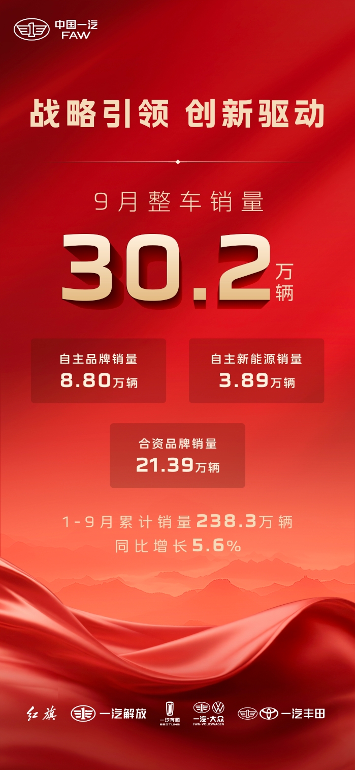 來源:創(chuàng)意傳播中心本網(wǎng)訊(記者 鄧涵予)2025年9月,中國一汽銷售整車30.2萬輛,同比增長6.3%。其中,自主品牌銷量8.8萬輛;自主新能源汽車銷量3.89萬輛,繼續(xù)保持高速增長態(tài)勢;合資品牌銷量21.39萬輛,持續(xù)鞏固市場領(lǐng)先地位。1—9月累計(jì)銷售238.3萬輛,經(jīng)營質(zhì)量持續(xù)提升。其中,自主品牌新能源增速顯著;節(jié)能車逆勢增長,銷量增幅明顯。數(shù)據(jù)的背后,是中國一汽踐行央企使命擔(dān)當(dāng),在自主品牌、合資品牌、海外突破、數(shù)智轉(zhuǎn)型等方面持續(xù)發(fā)力,生動(dòng)詮釋勇立時(shí)代潮頭、銳意創(chuàng)新進(jìn)取的奮斗之姿。